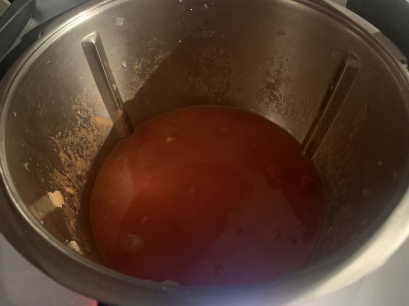 1. Mettre l’oignon dans le bol et mixer 5sec/vit5, ajouter l’huile et la pâte de curry puis faire chauffer 4 min/varoma/Vit mijotage, verser les pois chiches égouttés et les tomates et la pulpe, recouvrir d’eau, sale et poivre puis faire chauffer 18 minutes/varoma./couteau inversé/vit mijotage.