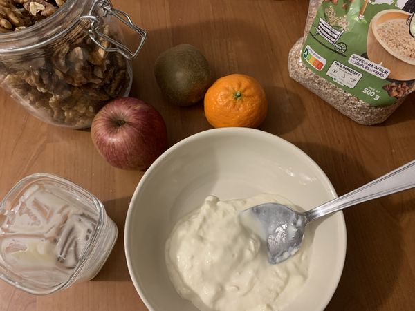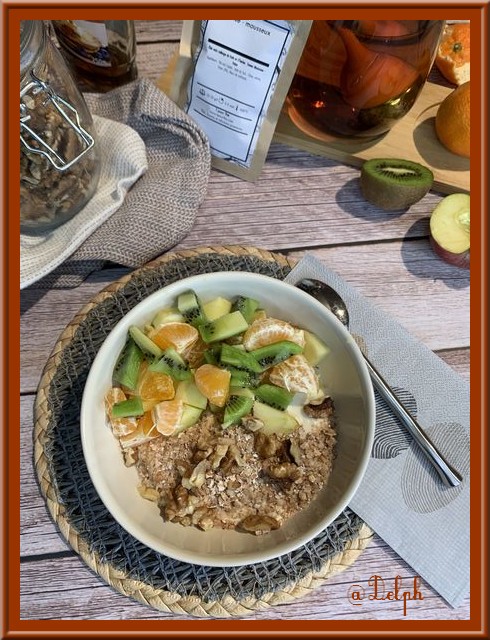 - Verser le yaourt dans le bol, parsemer de flocons de sarrasin et de cerneaux de noix puis déposer les fruits.