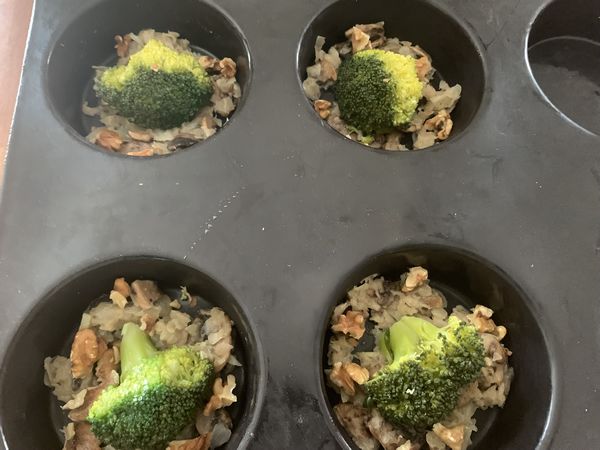 2. Disposer les légumes cuits au fond de vos empreintes, ajouter une fleurette de brocoli par empreinte.