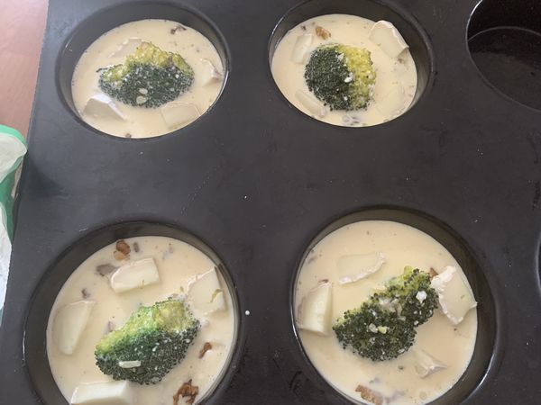 5. Verser votre appareil à clafoutis dans les empreintes du moule, disposer la rondelle de buche de chèvre coupée autour du brocolis puis parsemer d’un peu de noix..