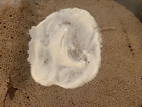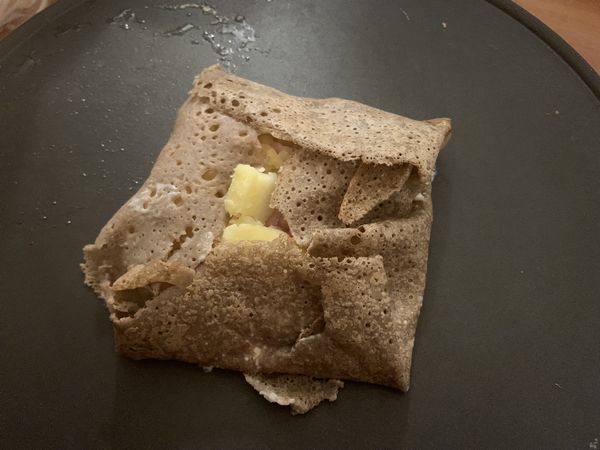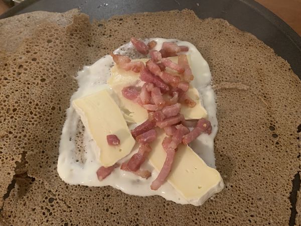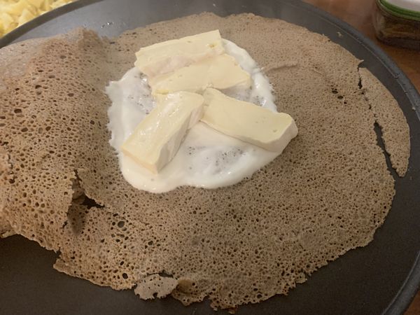 2. Mettre votre galette sur votre crêpière, étaler votre crème fraîche sur la galette, puis déposer quelques lamelles de reblochon.