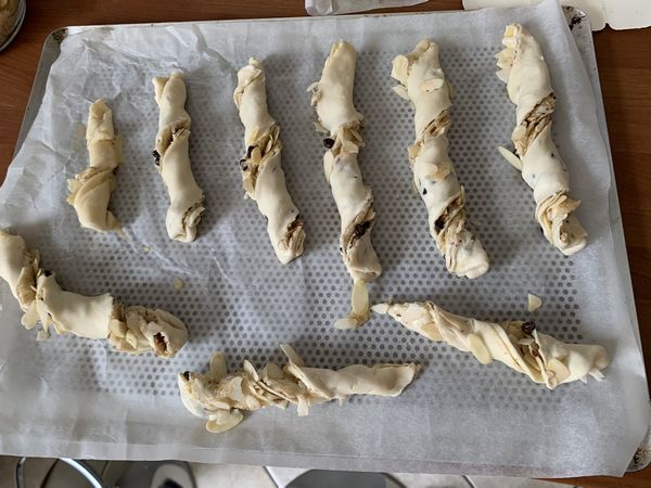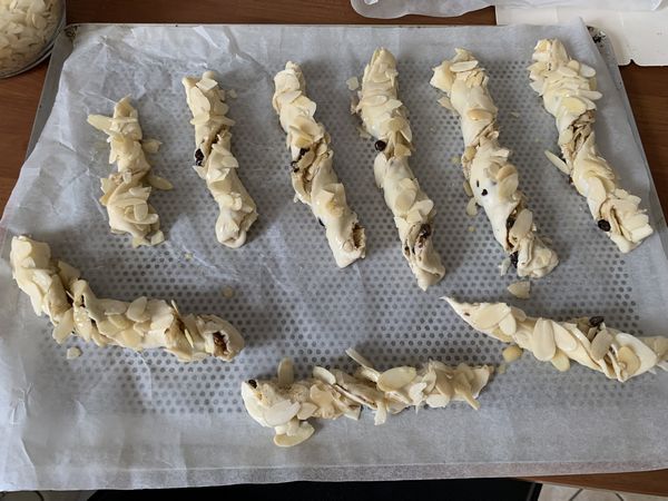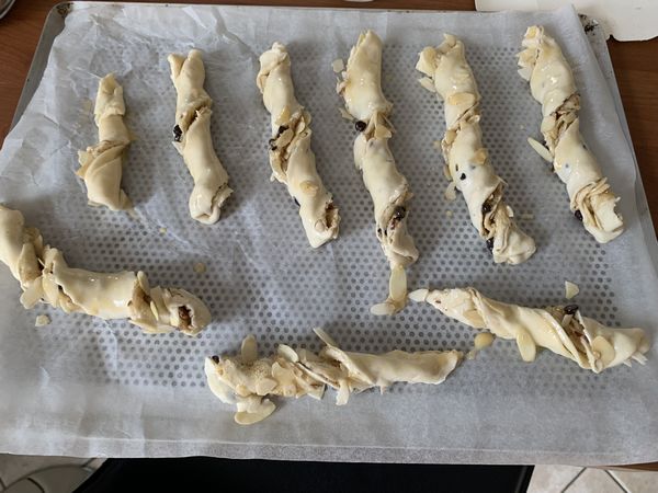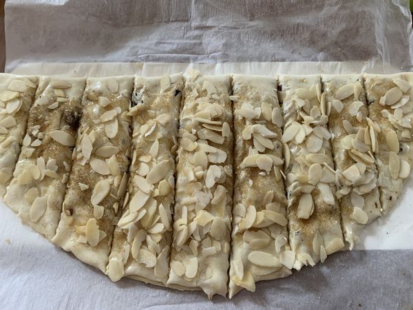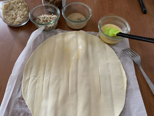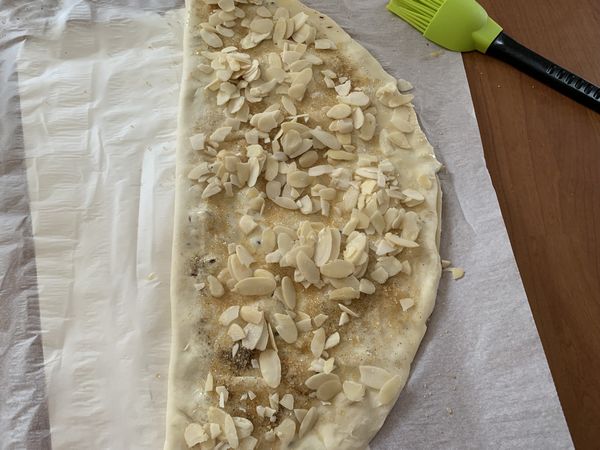 - Badigeonner avec le reste d’œuf, parsemer un peu d’amandes effilées.