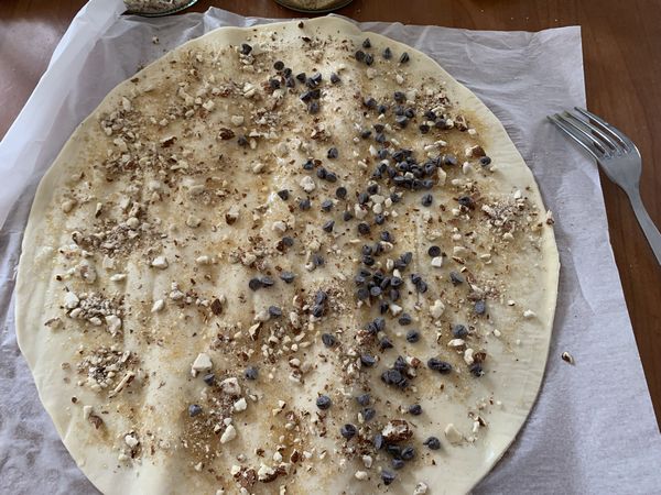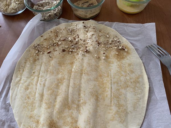 - Dérouler votre pâte feuilletée, puis la badigeonner d’œuf à l’aide d’un pinceau ( ne pas tout mettre), saupoudrer des sucres (utiliser les 2/3), puis parsemer les amandes concassées, et disperser un peu de pépites de chocolat sur une moitié seulement de pâte..