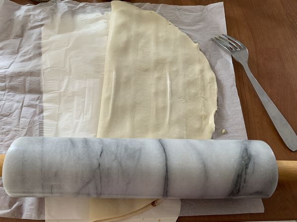 - Rabattre la moitié de la pâte, afin d ‘obtenir un chausson, puis avec un rouleau à pâtisserie, aplatir légèrement.