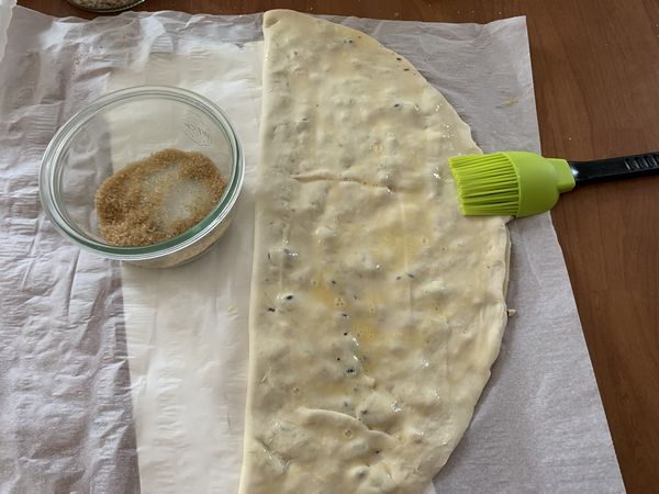 - Re-badigeonner d’œuf sur la moitié obtenue puis saupoudrer avec le reste de sucre, et mettre des amandes effilées, aplatir un peu.