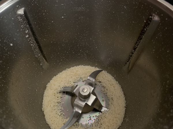 - Mettre le parmesan dans le bol et râper 7 sec/vit.10. Transvaser dans un récipient et réserver, inutile de rincer le bol.