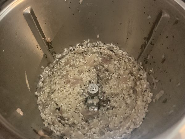 - Ajouter le bouillon, deux pincées de sel et de poivre , puis racler le fond du bol à l’aide de la spatule pour décoller le riz si nécessaire. Faire cuire 12 min/100°C/sens inversé/vit.1, en remplaçant le gobelet doseur par le panier cuisson sur le couvercle du bol pour éviter les projections.