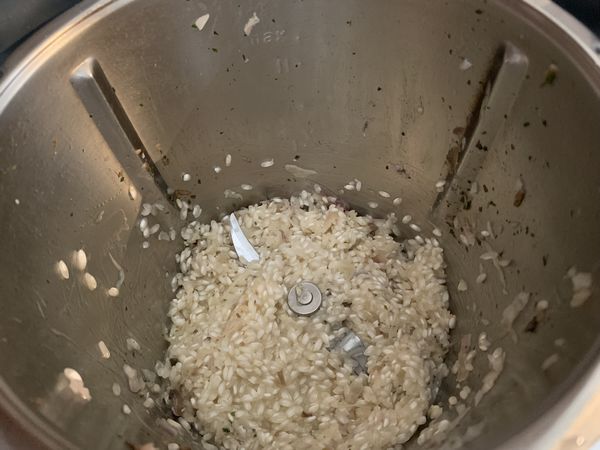 - Ajouter le riz et rissoler 3 min/120°C/sens inversé/vit.1, sans le gobelet doseur.