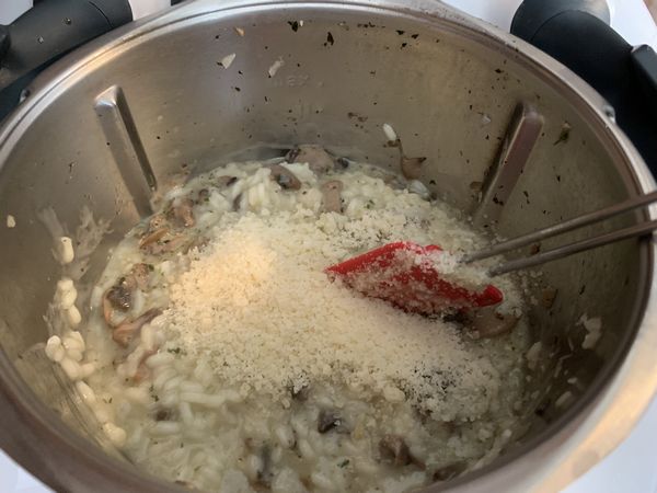 - A la fin de la cuisson, verser le parmesan, mélanger à l’aide la spatule puis laisser le risotto reposer dans le bol pendant 1 minute avant de le transvaser dans un plat.