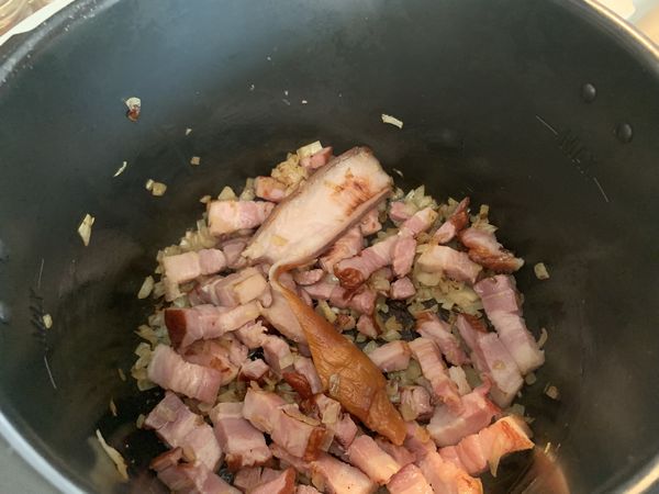 - Mettre votre Cookéo en mode dorer puis y verser l’huile, dès qu’elle est chaude, y mettre les oignons, mélanger puis laisser dorer 1 minute, ajouter les lardons, j’ai aussi mis le morceau de couenne pour donner du goût, mélanger et laisser dorer 2 minutes.
