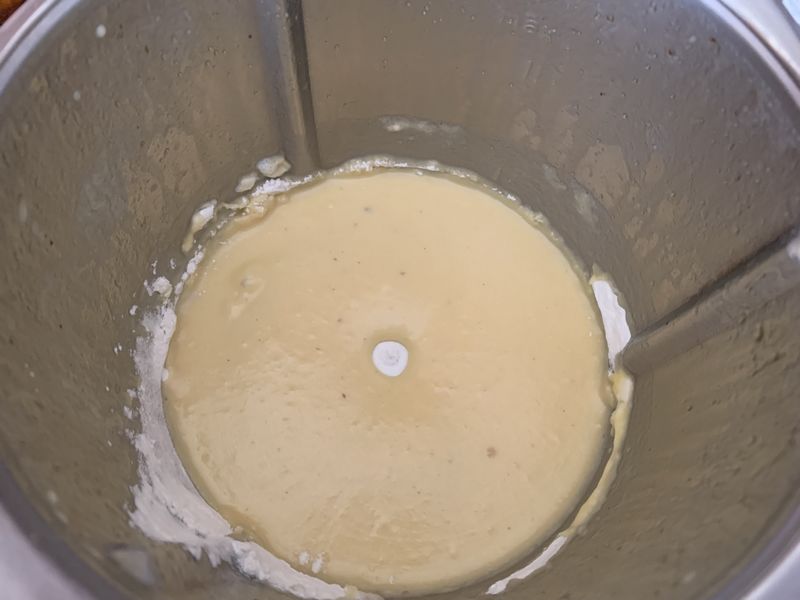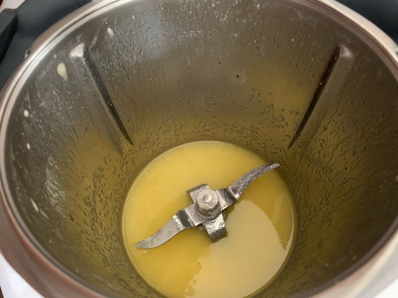 - Mettre à la place le beurre coupé en morceaux et faire fondre 4min/60°C/vit2, verser le sucre dessus et mélanger 1min/vit3.