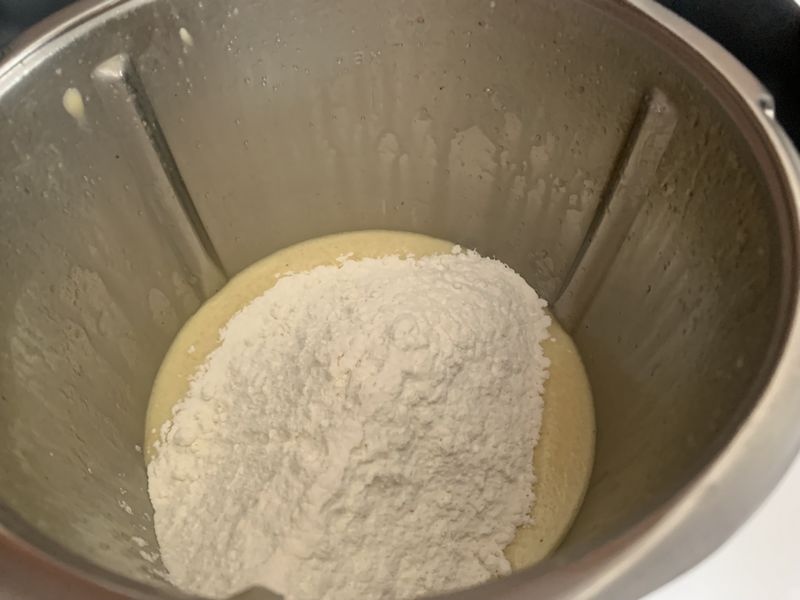 - Ajouter le miel, le vin blanc les œufs et mélanger 30sec/vit4. Incorporer la farine, la levure, et la pincée de sel, puis mélanger 30sec/vit3.