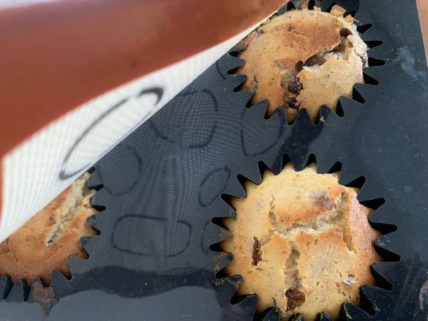 - Répartir cette pâte dans vos petits moules antiadhésifs ou des empreintes en silicone. J’ai mis une toile silpat sur le dessus pour éviter que cela ne gonfle.