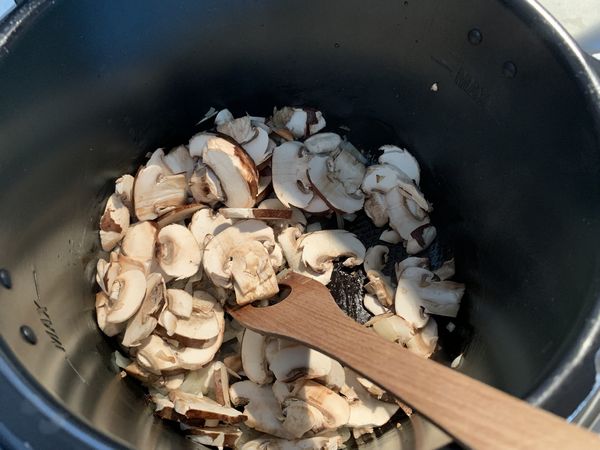 - En mode dorer, faire revenir l’oignon émincé dans un peu d’huile d’olive. Ajouter ensuite l’ail pressé, les champignons et la persillade. Laisser revenir environ 2 minutes.