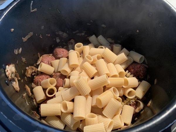 - Verser les pâtes puis recouvrir de bouillon et de coulis de tomates, assaisonner de sel et de poivre puis passer sous pression pour 6 minutes.