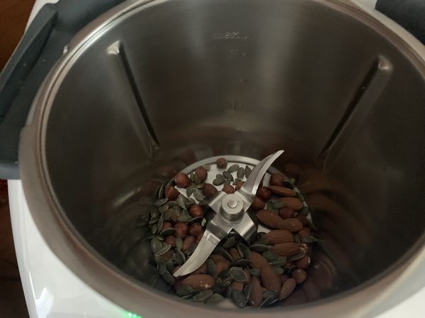 - Mettre dans le bol du Thermomix les noisettes, les amandes, les graines de courge puis mixer 5sec/vit6.