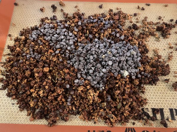 - Lorsque le mélange est bien doré, le retirer du four et répartir les pépites sur le dessus.