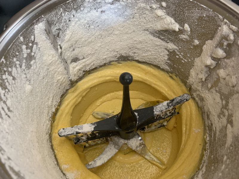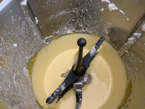 - Mettre les jaunes et le sucre, toujours avec le fouet mélanger 1min/vit3, ajouter a farine et mélanger 1min/vit3.