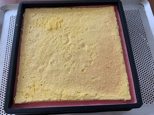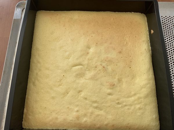 - Verser la mousse, puis mettre par dessus le carré de génoise et placer au congélateur toute une nuit.