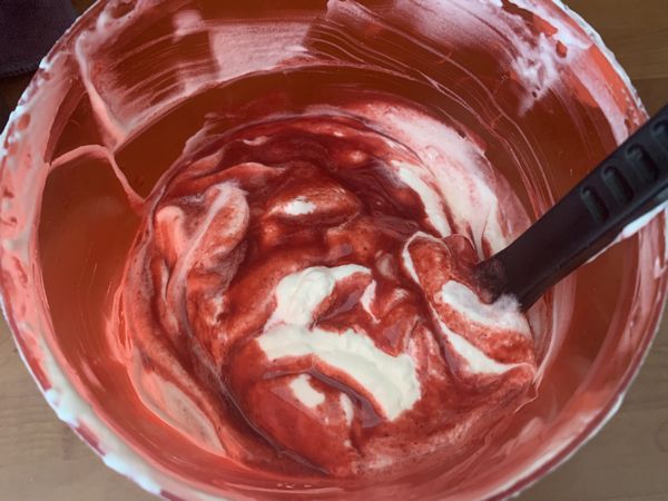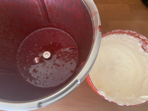 - Lorsque la purée de fraise est tiède, incorporer votre chantilly progressivement en mélangeant délicatement avec une maryse.