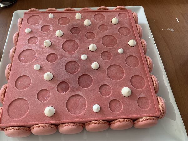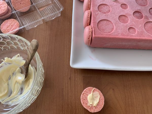- Décorer le lendemain comme vous le souhaitez, j’ai collé les macarons avec un peu de chocolat blanc et j’ai fait fondre des pistoles de chocolat blanc sur ma planque empreintes de ronds, j’ai ajouté quelques meringuettes, puis placer au réfrigérateur entre 4 et 5 heures pour le déguster décongelé.