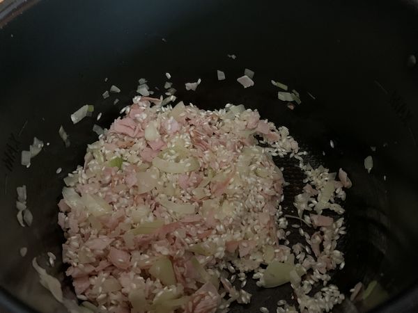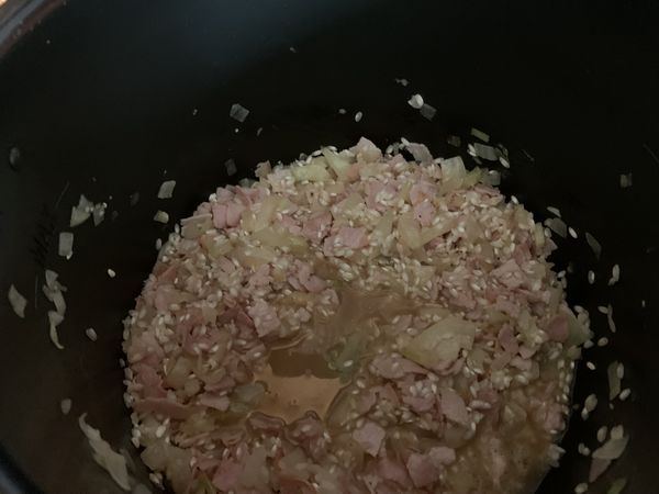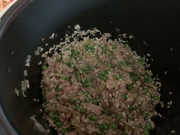 - Ajouter le bacon coupé en dés, mélanger, ajouter le riz puis le vin blanc, mélanger laisser environ 2 minutes toujours en mélangeant, ajouter les petits pois, mélanger à nouveau. Assaisonner avec un peu de sel, du poivre et le thym, verser le bouillon, mélanger.