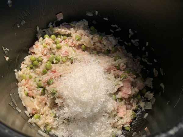 - Passer en mode sous pression pour 6 minutes, mettre le parmesan râpé en garder un peu pour le dressage des assiettes, mélanger, puis laisser 1 minute en maintien au chaud.