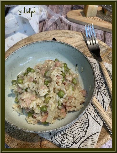 Quel beau risotto! En plus avec des petits pois and of course du bacon, c’est tout ce que j’aime. Bonne journée! Bises, ~Nessa