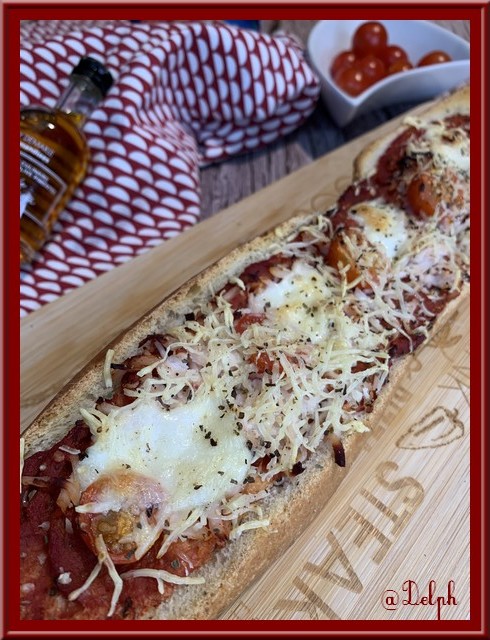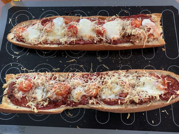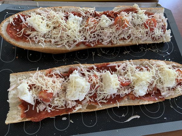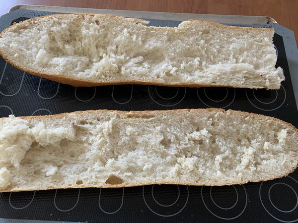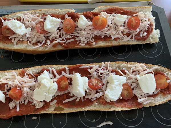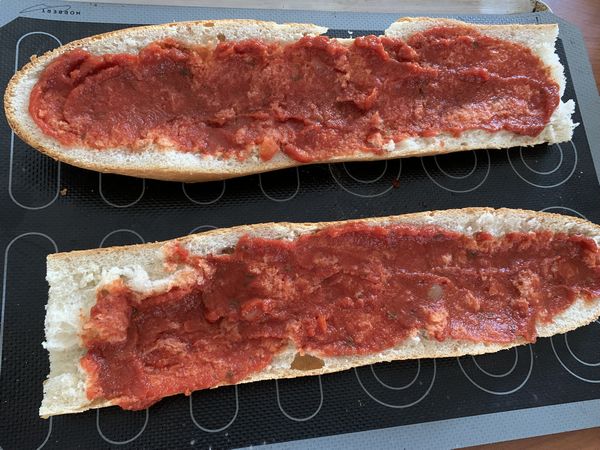 1. Couper votre demi-pain dans la longueur, enlever un peu de mie, à l’aide d’une cuillère à soupe, étaler de la sauce pizza sur toute la longueur..