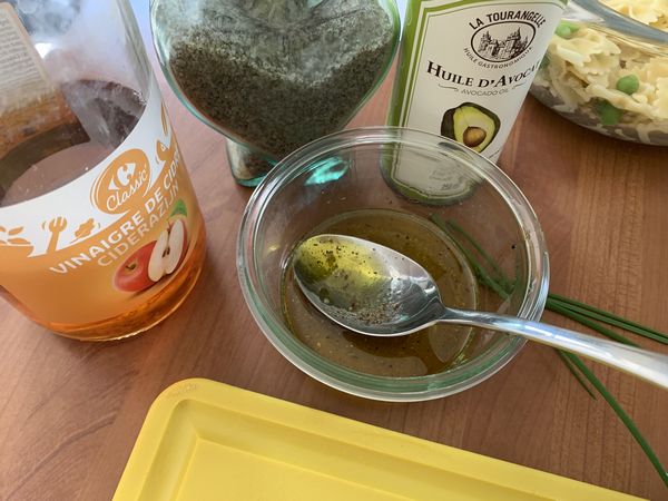 - Préparer la vinaigrette en mélangeant le vinaigre et l’huile, assaisonner avec un peu de sel et du poivre.