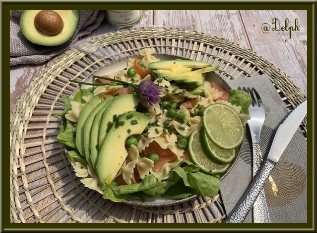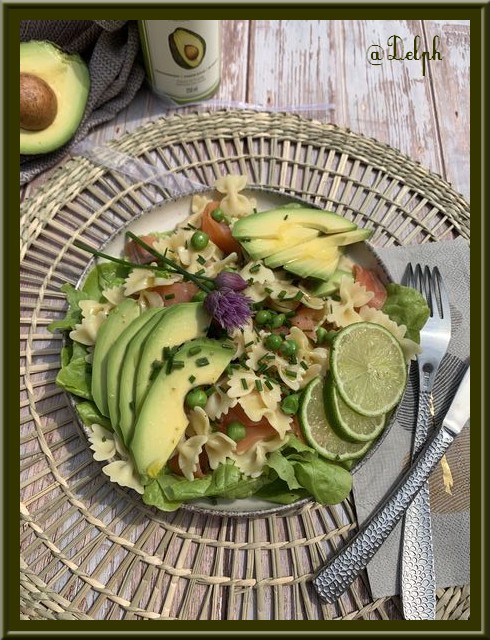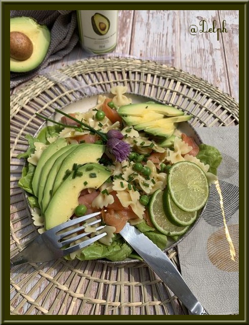 - Dresser votre assiette en disposant des feuilles de salades, sur votre assiette, puis poser les lanières de saumon, les pâtes mélangées aux petits pois, poser des lamelles d’avocat.
