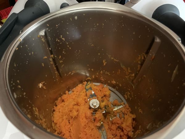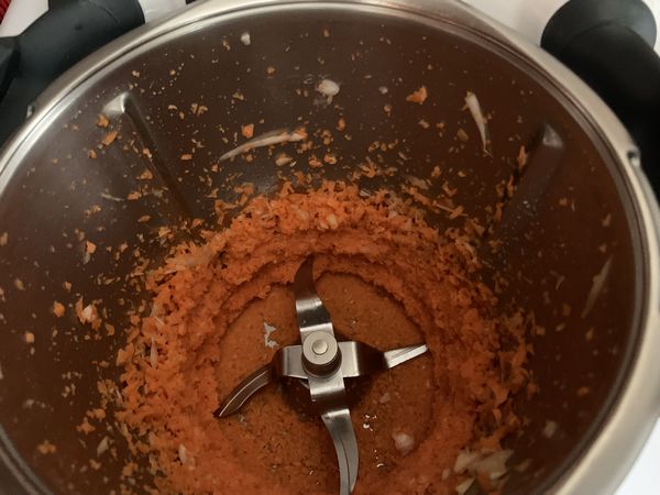 2. Inutile de rincer le bol, mettre l’ail, l’oignon coupé en 4, la carotte épluchée et lavée coupée en morceaux et hacher 5sec/vit7, racler les bords avec la spatule.