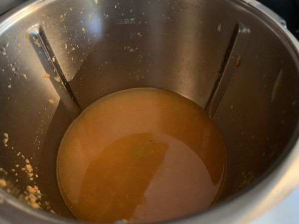 6. Ajouter les pâtes et cuire 10 à 12 min/100°C/couteau inversé/vit mijotage. (Mettre le panier de cuisson à la place du gobelet doseur pour éviter les éclaboussures.)