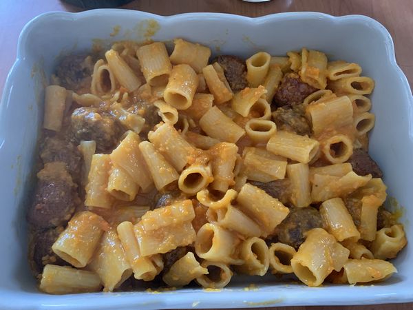 8. Verser les pâtes avec la sauce tomate dans un plat allant au four ajouter les boulettes de viande, et mélanger le tout délicatement.