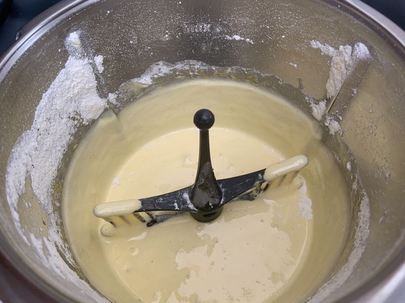 - Insérer le fouet dans le bol puis mettre les œufs et le sucre, fouetter 1 min/vit3, Ajouter la farine et l’extrait de vanille et mélanger 30sec/vit3.