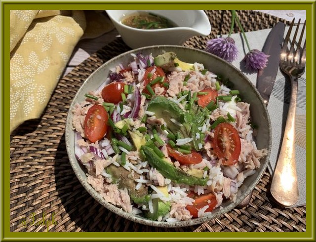 4. Mettre dans votre assiette le riz froid déjà cuit, les tomates cerise, l’oignon ciselé, l’avocat et le thon, mélanger délicatement le tout, placer au frais jusqu’au moment de servir..