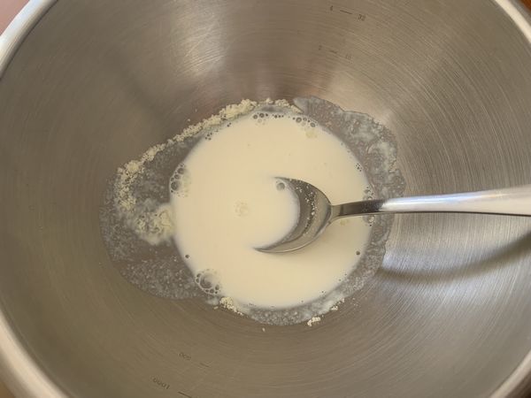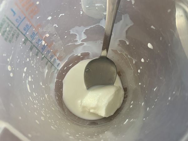 3. Faire dissoudre le lait en poudre dans un peu de lait, puis ajouter le reste du lait. Verser le yaourt dans un récipient et commencer à la délayer avec le mélange de laits, incorporer ensuite le reste.