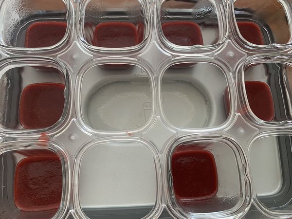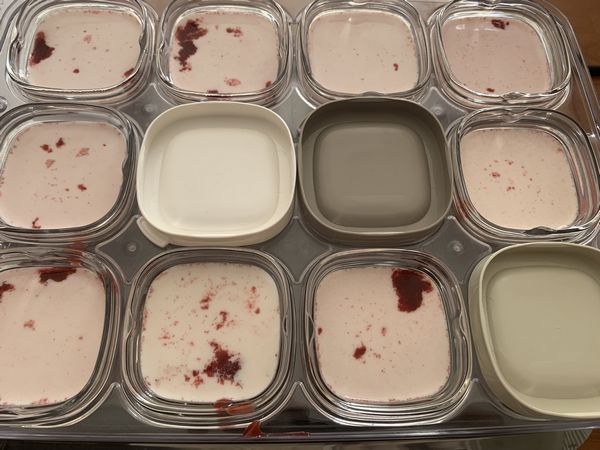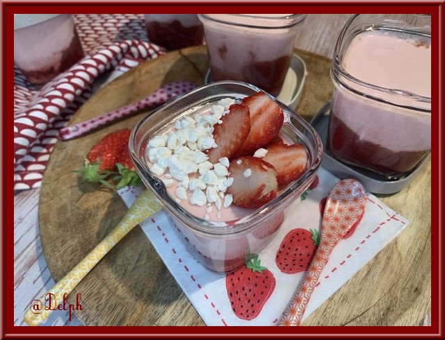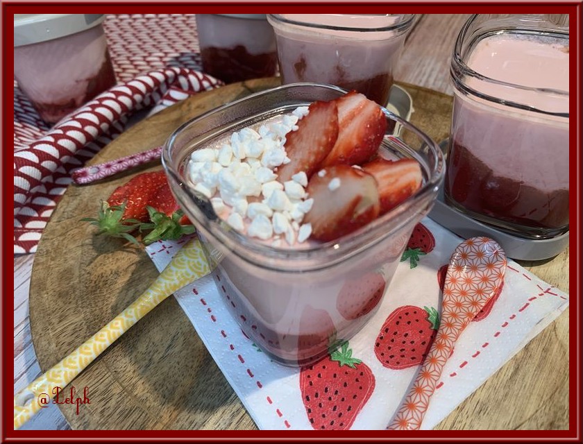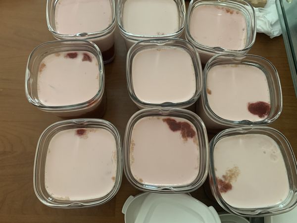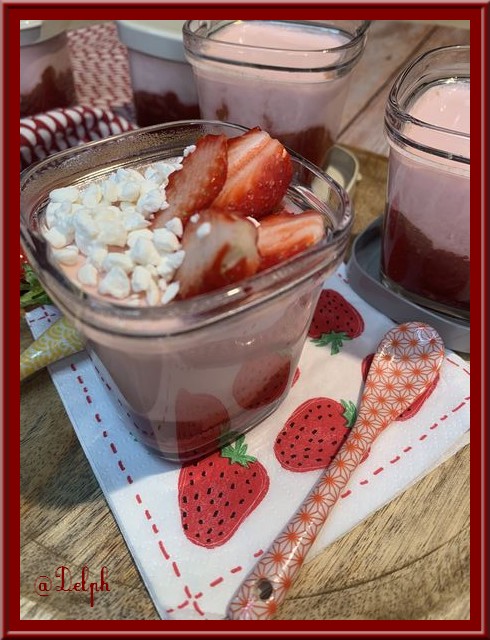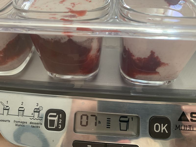 4. Répartir dans les pots, sur le coulis et faire prendre en yaourtière entre 6 à 8 heures, 7 heures pour moi.