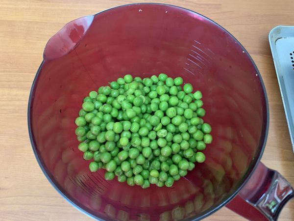 - Écosser vos petits pois et les faire cuire dans une grande casserole d’eau bouillante salée pendant 6 minutes. Les égoutter et les passer sous de l’eau froide.