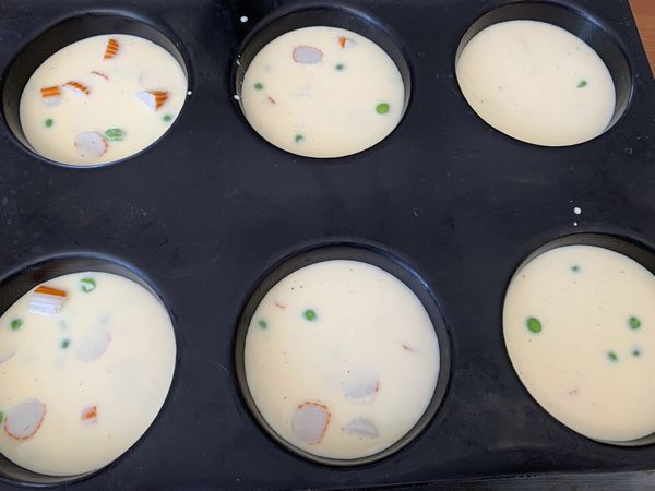 - Déposer votre moule à empreintes de grands ronds sur votre plaque métallique, puis répartir dans chaque empreinte les petits pois, puis le surimi coupé en fines lamelles.