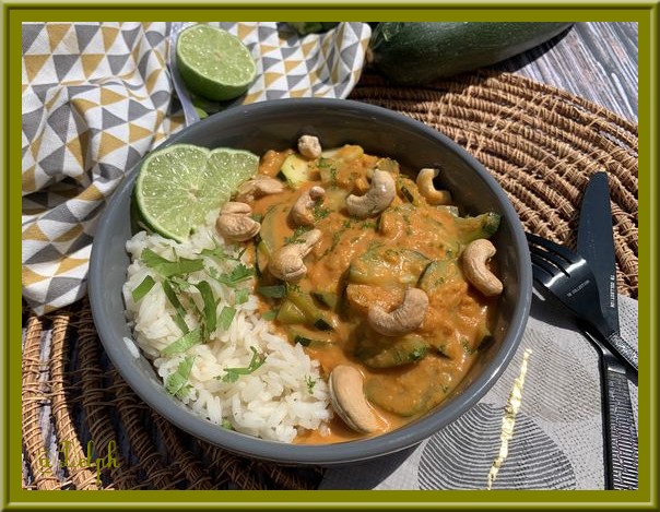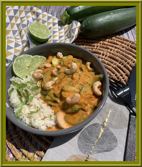 Je vous propose un plat végétarien plein de saveurs. Les courgettes sont bien fondantes et délicieusement enrobées par cette sauce au lait de coco. Bien sûr vous pourrez le proposer avec un poisson ou une viande blanche.