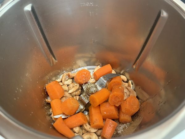 - Placer les carottes et les noix de cajou dans dans le bol de votre Thermomix, ajouter la gousse d’ail pelée et dégermée, les huiles, le cumin, le jus de citron, assaisonner à votre goût puis mixer 10 sec/vit5, racler les bords, puis mixer 10sec/vit8, détendre avec 4 cuillère à soupe d’eau de cuisson, racler les bords, puis mixer à nouveau 8sec/vit8. Vous pouvez à nouveau remettre 2 cuillères soupe d’eau de cuisson puis mixer à nouveau 8sec/vit8.