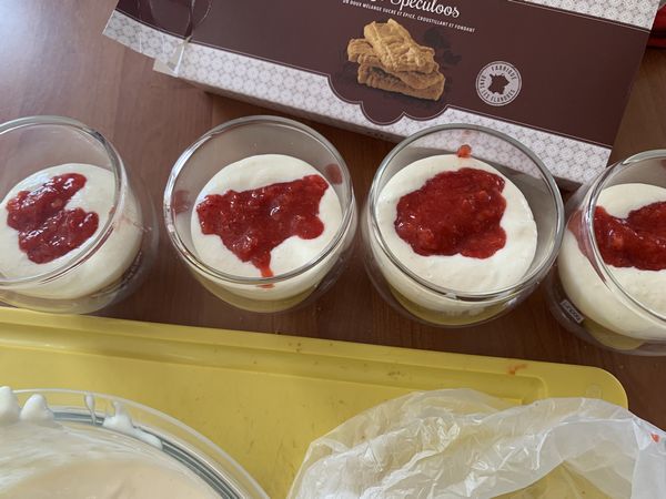 - Dans les verrines disposer une couche de spéculoos, puis par dessus mettre la purée de fraise puis la crème remettre un peu de spéculoos, puis disposer quelques fraises.