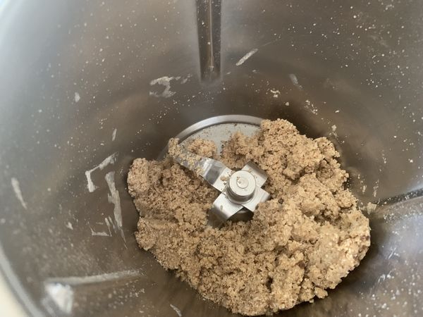 - Préparer le crumble: Mettre dans le Thermomix, la farine, la poudre d’amande, le sucre et le beurre coupé en morceaux. Puis mixer 8sec/vit6.