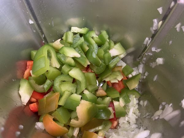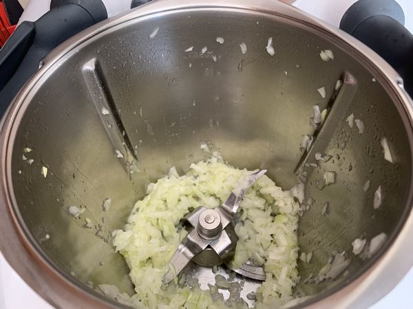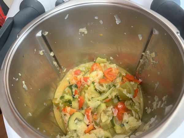 - Éplucher et couper l’oignon en 4 le déposer dans le bol du Thermomix puis mixer 5sec/vit5, ajouter les poivrons, lavés, coupés et épépinés puis coupés en petits morceaux puis faire chauffer 4 min/varoma/vit1. Ajouter les courgettes, lavées, épluchées et coupées en fine rondelles puis faire chauffer 15min/100°/couteau inversé/vit1. En fin de cuisson, égoutter vos légumes, pour enlever le jus de cuisson. Inutile de rincer le bol.