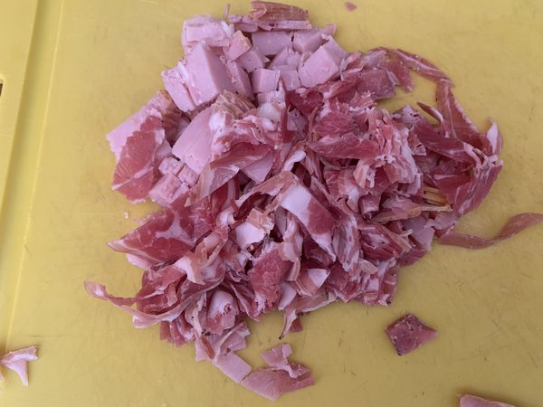 - Pendant ce temps détailler le bacon et la pancetta en petits morceaux.
