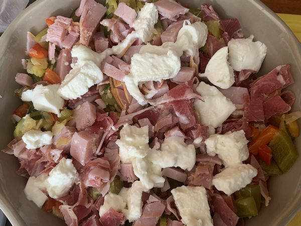 - Dans un plat allant au four déposer au fond les légumes que vous aurez égouttés pour enlever tout le jus de cuisson, puis mettre les morceaux de bacon et pancetta, enfin détailler la mozzarella en petits bouts et la disperser sur le dessus.