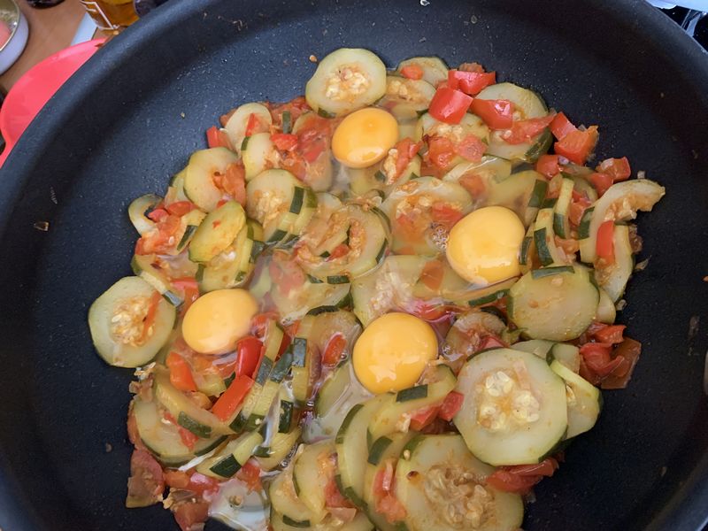 - Pour finir casser les œufs sur les légumes et faire cuire 2 à 3 minutes.