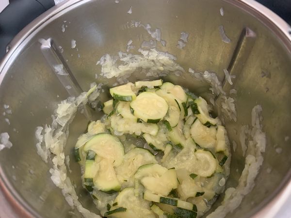 1. Éplucher et couper l’oignon en 4, éplucher et dégermer la gousse d’ail, mettre le tout dans le bol du Thermomix puis mixer 5sec/vit5, ajouter l’huile d’olive et les courgettes, épluchées lavées et couper en fines rondelles, puis faire chauffer 15min/100°C/vit mijotage.