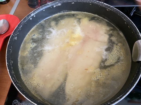 6. Pendant ce temps, faire frémir de l’eau avec le cube de bouillon de légumes. Déposer le cabillaud dans l’eau frémissante pendant 5 minutes. Égoutter, enlever les arêtes s’il y en a puis émiettez-le grossièrement.
